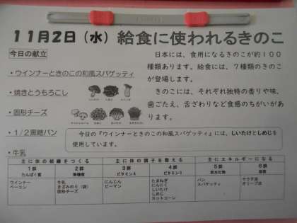 給食では、しいたけ、しめじ、エリンギ、マッシュルーム、なめこ、まいたけ、えのきだけの7種類が献立内容に合わせて使われています。本日の献立「ウインナーときのこの和風スパゲッティ」では、しいたけとしめじが使われました。