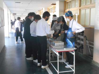 (写真は、2年生廊下での2年生の給食準備の様子です。)