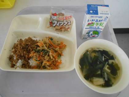 本日の献立は、ビビンバ、わかめスープ、アーモンドフィッシュ、牛乳です。