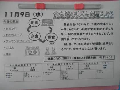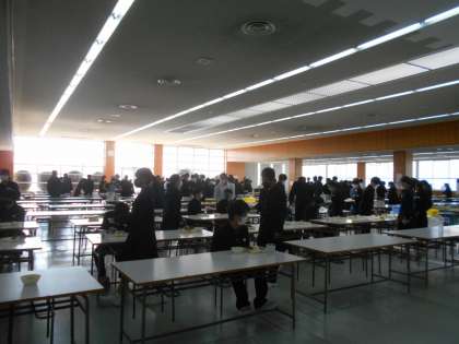(写真は、昼食ホールでの3年生の給食準備の様子です。)