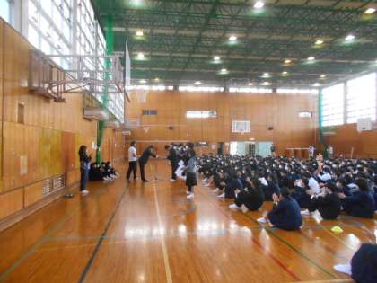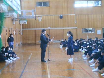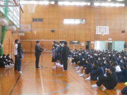 全校集会では、バドミントン部女子ダブルスの賞状伝達を行いました。