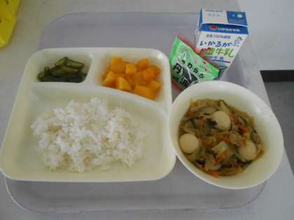 本日の献立は、中華丼、キュウリのピリ辛和え、桜桃、ソフト黒豆、牛乳です。