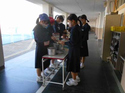 (写真は、2年生廊下での2年生の給食準備の様子です。)
