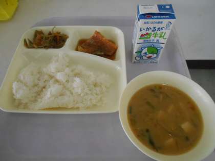 本日の献立は、ごはん、赤魚の醤油だれかけ、きんぴらごぼう、なめこの味噌汁、牛乳です。