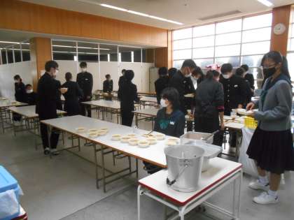 (写真は、昼食ホールでの3年生の給食準備の様子です。)