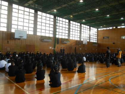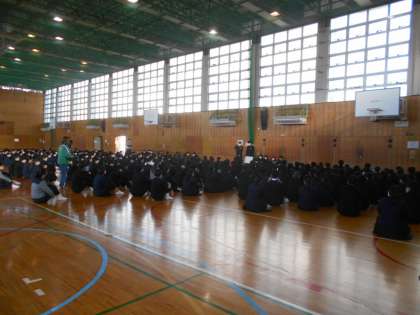 本日、体育館において生徒会集会を行いました。各生徒専門委員会の代表者から報告がありました。また、後期生徒会役員からは、後期の生徒会の運営に携わって、新たな決意表明が述べられました。