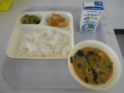 本日の献立は、ごはん、鶏肉のおろし醤油かけ、小松菜の炒めもの、味噌汁、牛乳です。
