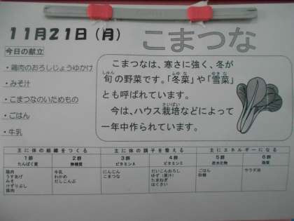 本日の献立「小松菜の炒めもの」の食材である「小松菜」は、寒さに強くて冬が旬となる野菜です。「冬菜(ふゆな)」や「雪菜(ゆきな)」とも呼ばれていますが、ハウス栽培により一年中つくられている野菜です。