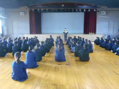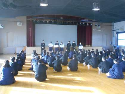 2年生の学年集会を講堂で行いました。学年主任の安田先生からは、仲間の頑張りに対して応えることの大切さと気を緩めることなく有意義な2学期を過ごすことについてのお話がありました。また、代議員の発表や体育委員からの連絡がありました。