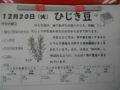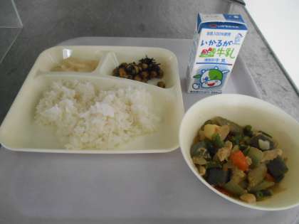 本日の献立は、ごはん、ひじき豆、鶏肉と野菜の煮物、かぶのゆず風味、牛乳です。