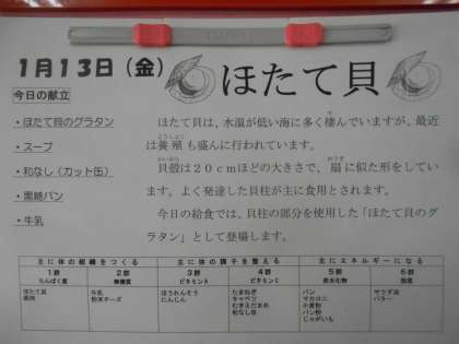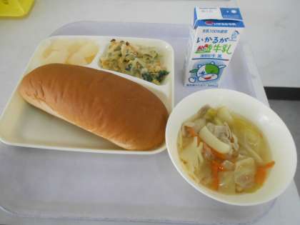 本日の献立は、黒糖パン、ホタテ貝のグラタン、スープ、和なし、牛乳です。