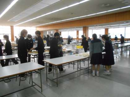 (写真は、昼食ホールでの3年生の給食準備の様子です。)