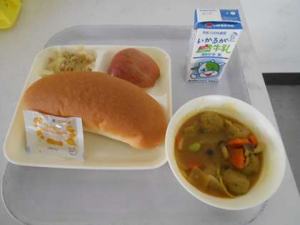 本日の献立は、コッペパン、マーマレード、ミートボールと野菜のカレー煮、ツナとキャベツのソテー、リンゴ、牛乳です。