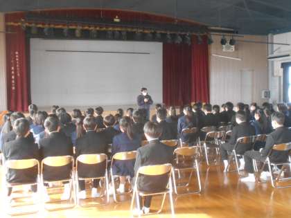 3年生の学年集会を講堂で行いました。柴田先生から、卒業までに残された1か月余りの期間をどのように過ごすのかを今一度しっかりと考えてほしいというお話がありました。