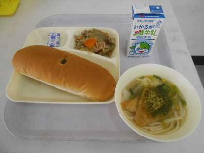 本日の献立は、レーズンパン、固形チーズ、豚肉とごぼうの煮物、なにわうどん、牛乳です。