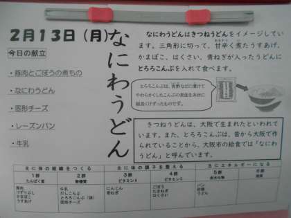 本日の献立で登場した「なにわうどん」は、きつねうどんをイメージしてつくられたもので、三角形に切って甘辛く煮た薄揚げと、かまぼこ、白菜、青ネギの入ったうどんにトロロ昆布を入れて食べます。