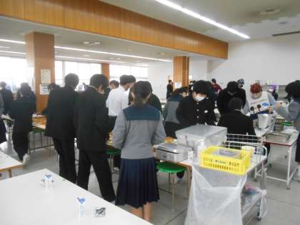 (写真は、昼食ホールでの1年生の給食準備の様子です。)