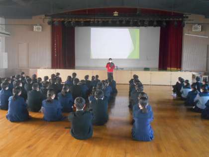 2年生の学年集会を講堂で行いました。学年主任の安田先生から、集団での団体行動の意義について考えてほしいというお話がありました。