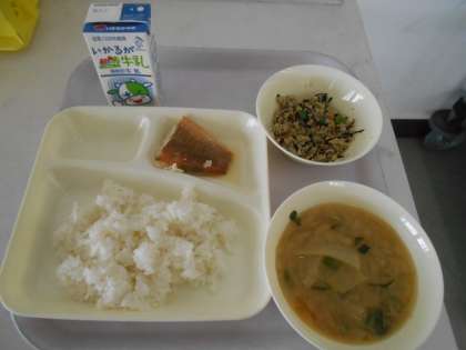 本日の献立は、ごはん、赤魚のレモン醤油かけ、高野豆腐の炒り煮、味噌汁、牛乳です。