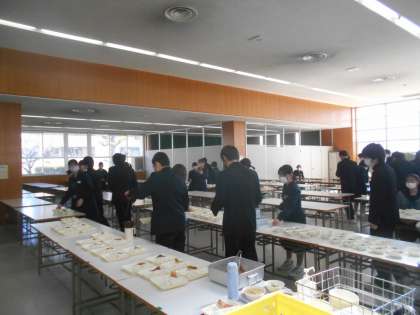 (写真は、昼食ホールでの3年生の給食準備の様子です。)