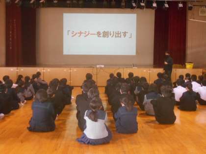 1年生の学年集会を講堂で行いました。吉江先生から、「シナジー(みんなでつくりあげる力)を創り出す」ことについてのお話がありました。