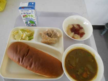 本日の献立は、黒糖パン、フライドチキン、カレーシチュー、キャベツとコーンのサラダ、フルーツぜりー、牛乳です。