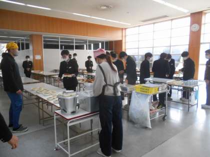 (写真は、昼食ホールでの3年生の給食準備の様子です。)