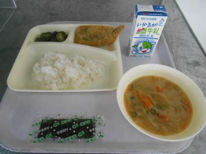 本日の献立は、ごはん、焼きのり、いわしフライ、キュウリの赤じそ和え、味噌汁、牛乳です。