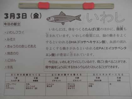本日のメニュー「いわしフライ」の食材である「いわし」には、タンパク質や脂質が豊富に含まれています。