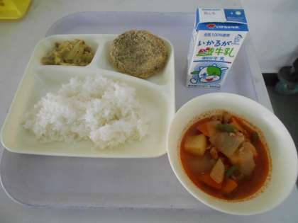本日の献立は、ごはん、チキンレバーカツ、ケチャップ煮、ツナとキャベツのバジルソテー、牛乳です。