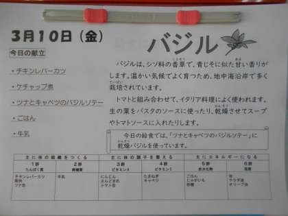 本日の献立「ツナとキャベツのバジルソテー」で使われた「バジル」は、シソ科の香草で、青じそに似た甘い香りがします。トマトと組み合わせて、イタリア料理によく使われます。