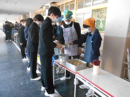 (写真は、2年生廊下での2年生の給食準備の様子です。)