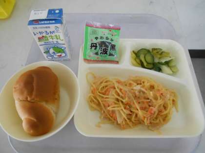 本日の献立は、黒糖パン、鮭のクリームスパゲッティ、キャベツとキュウリのサラダ、ソフト黒豆、牛乳です。