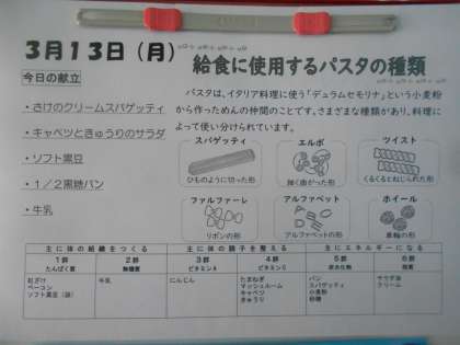 本日の献立では「鮭のクリームスパゲッティ」が登場しましたが、学校給食では様々なパスタ料理があり、スパゲッティ以外にはエルボ、ツイスト、ファルファーレ、アルファベット、ホイールなどが使われます。