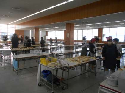 (写真は、昼食ホールでの1年生の給食準備の様子です。)
