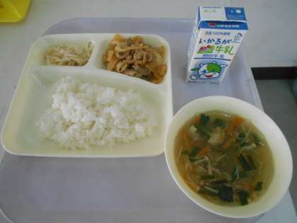 本日の献立は、ごはん、豚肉のコチジャン炒め、モヤシのナムル、鶏肉と春雨のスープ、牛乳です。