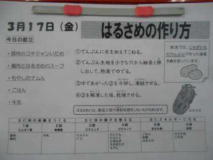 本日の献立「鶏肉と春雨のスープ」は、ジャガイモのでんぷんから作られた春雨を使っています。