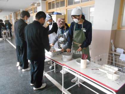 (写真は、2年生廊下での2年生の給食準備の様子です。)