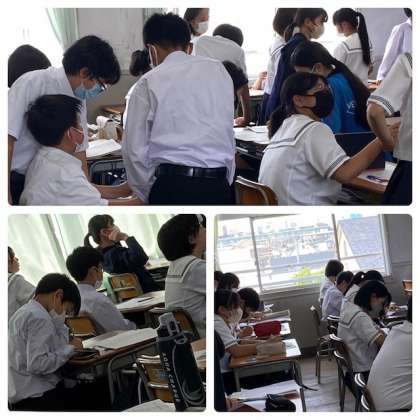 5限目、1年生の教室では、先週の中間テストを受けて、わからなかった所を教え合う、テスト問題をもう一度取り組む、字を丁寧に書くことについて指導を受けるなど、今後につながる学習が行われていました。