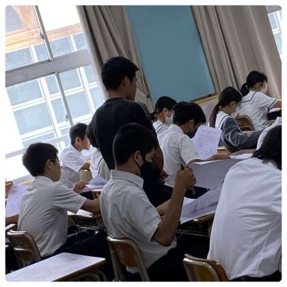 3年生は、今年度最初の実力テストが行われています。昨日の特別活動の時間では、修学旅行のレクリエーションに向けた練習など楽しそうな雰囲気でしたが、現在は一転して真剣モード。