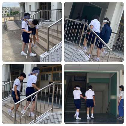 2年生は、総合福祉センターやオガリ作業所などの地域にある施設見学や、学校内の誘導ブロックや警告ブロック、あるいは階段を活用して、アイマスク体験的な学習に取り組みました。