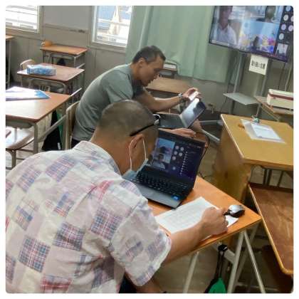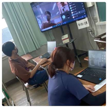 今後の学習や連絡方法を想定し、学校の端末と皆さんの端末とをつなぐテストを行いました。カメラテストでは、皆さんと一緒に映ろうとする保護者の方がおられたりと、とても微笑ましい光景もありました。