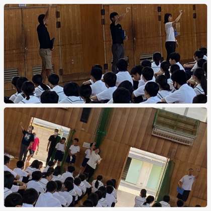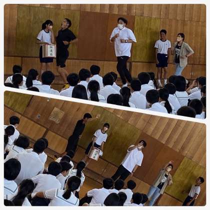 10月開催予定の体育大会に向けて、体育委員の運営による抽選会が行われました。安田先生の演出もなかなか良かったです。それぞれのクラスの先生が箱の中からボールを1つ取って縦割り団が決定しました。
