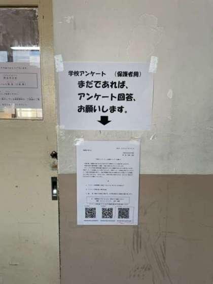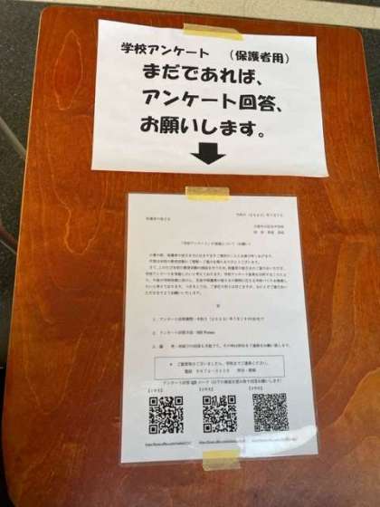 先日よりお願いしております学校アンケートですが、まだお済みでない方は懇談前の待ち時間でもしていただけます。ご不明な点があれば、だれにでもご質問ください。
