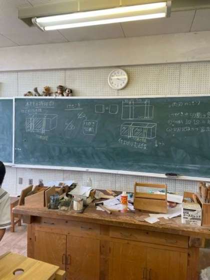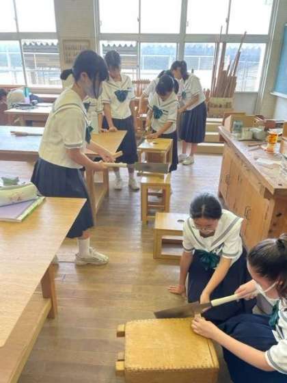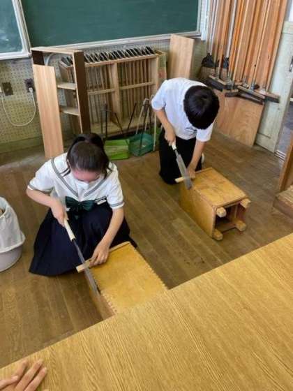 技術の授業では、木材をノコギリで切断していました。