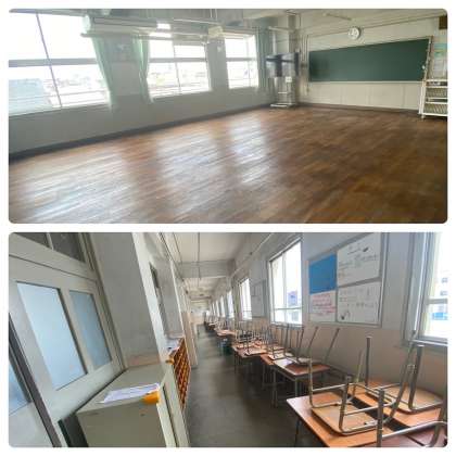 学活を終えた教室は、油引きをして、早くも2学期に向けた準備を始めていました。教室って、机がなければ案外広いものですね。