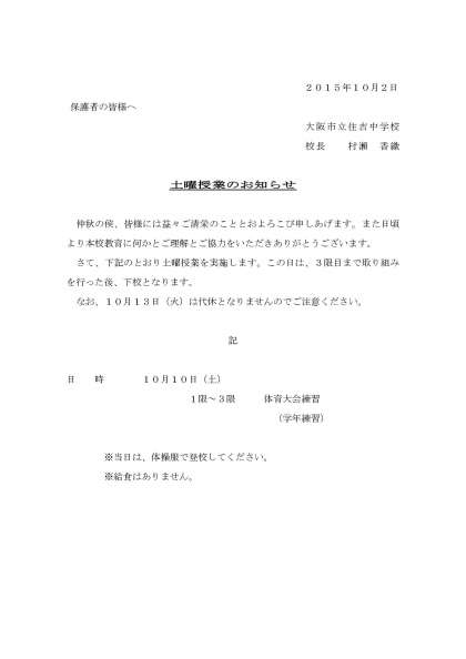 土曜授業のお知らせ 10月