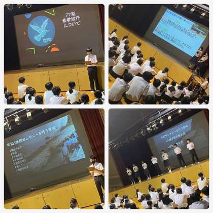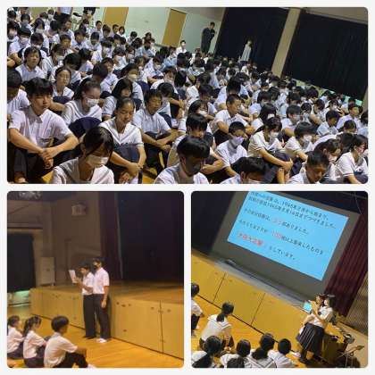 本校では、各学年の取組報告を通して、戦争の恐ろしさ、平和の大切さを学び、自分ごととして何ができるのかを考える機会をつくることを目的に、8月の登校日を平和人権登校日として取り組んでいます。