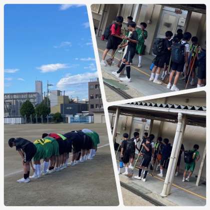 サッカー部は、他校へ出向いて練習試合を行いました。右側の写真は試合終了後に使わせていただいた場所を清掃している様子です。