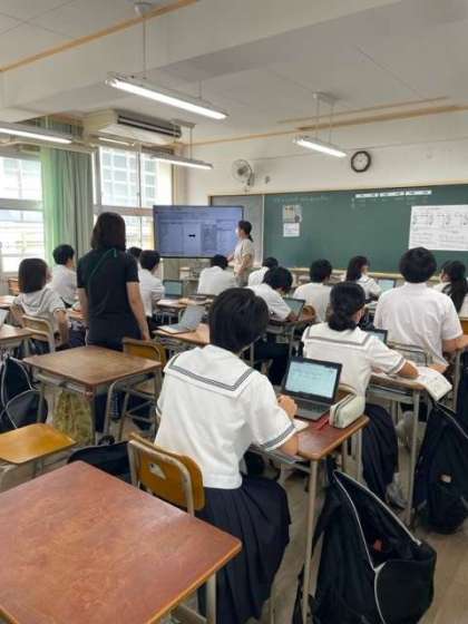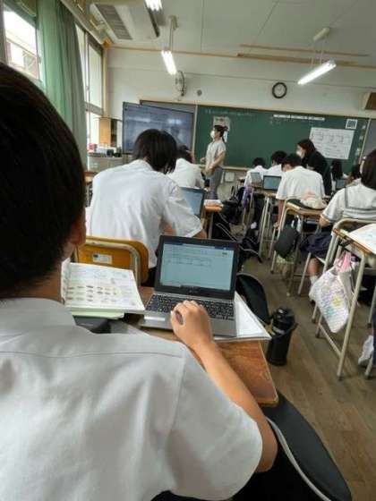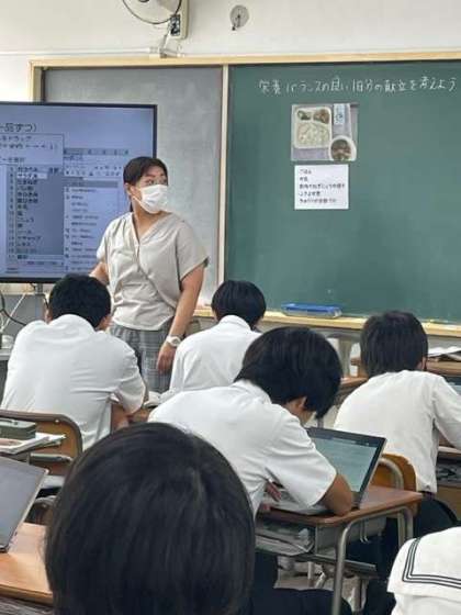 今日は2年生・家庭科の授業で一人一台端末を活用した栄養の授業がありました。カロリー計算の表をクラウドから選択し、朝ごはんや昼ご飯、夜ご飯、3食のカロリーを計算するといった学習を行っていました。